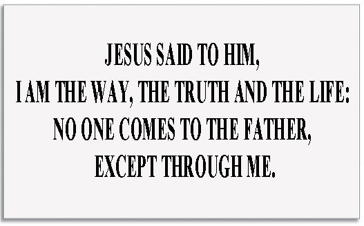 JOHN 14: 6 “JESUS SAID TO HIM, I AM THE WAY, THE TRUTH AND THE LIFE: NO ONE COMES TO THE FATHER, EXCEPT THROUGH ME.” (NKJV, KJV, ASV, ESV, NIV, TLB)