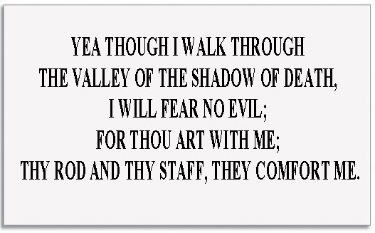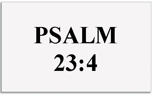 PSALM 23:4 “YEA THOUGH I WALK THROUGH THE VALLEY OF THE SHADOW OF DEATH, I WILL FEAR NO EVIL; FOR THOU ART WITH ME; THY ROD AND THY STAFF, THEY COMFORT ME.” (KJV, NKJV, ESV, NASB)